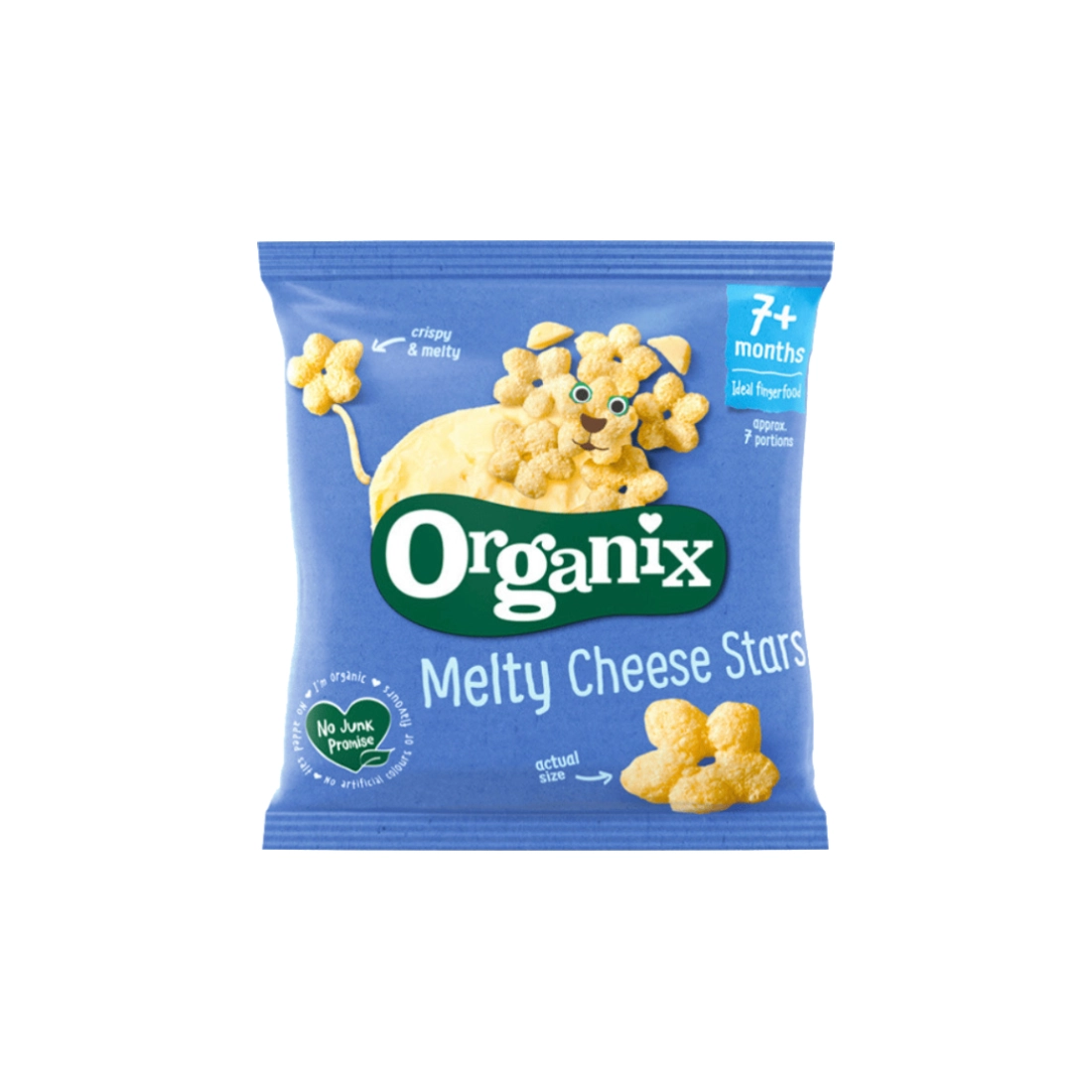 Βιολογικά Σνακ Καλαμποκιού με επικάλυψη τυριού, σε σχήμα Αστεράκια, χωρίς γλουτένη, χωρίς πρόσθετη ζάχαρη και αλάτι και χωρίς τεχνητό άρωμα και χρώμα. Είναι ειδικά σχεδιασμένα, ώστε να λιώνουν στο στόμα για να μην πληγώνουν τα ευαίσθητα ούλα των παιδιών και να καταναλώνονται με ασφάλεια, ενώ το σχήμα και το μέγεθος τους είναι κατάλληλο για μικρά χεράκια, ενθαρρύνοντας τα να τρώνε μόνα τους. Ένα υγιεινό, ψημένο και όχι τηγανισμένο σνακ, κατάλληλο για βρέφη άνω των 7 μηνών.